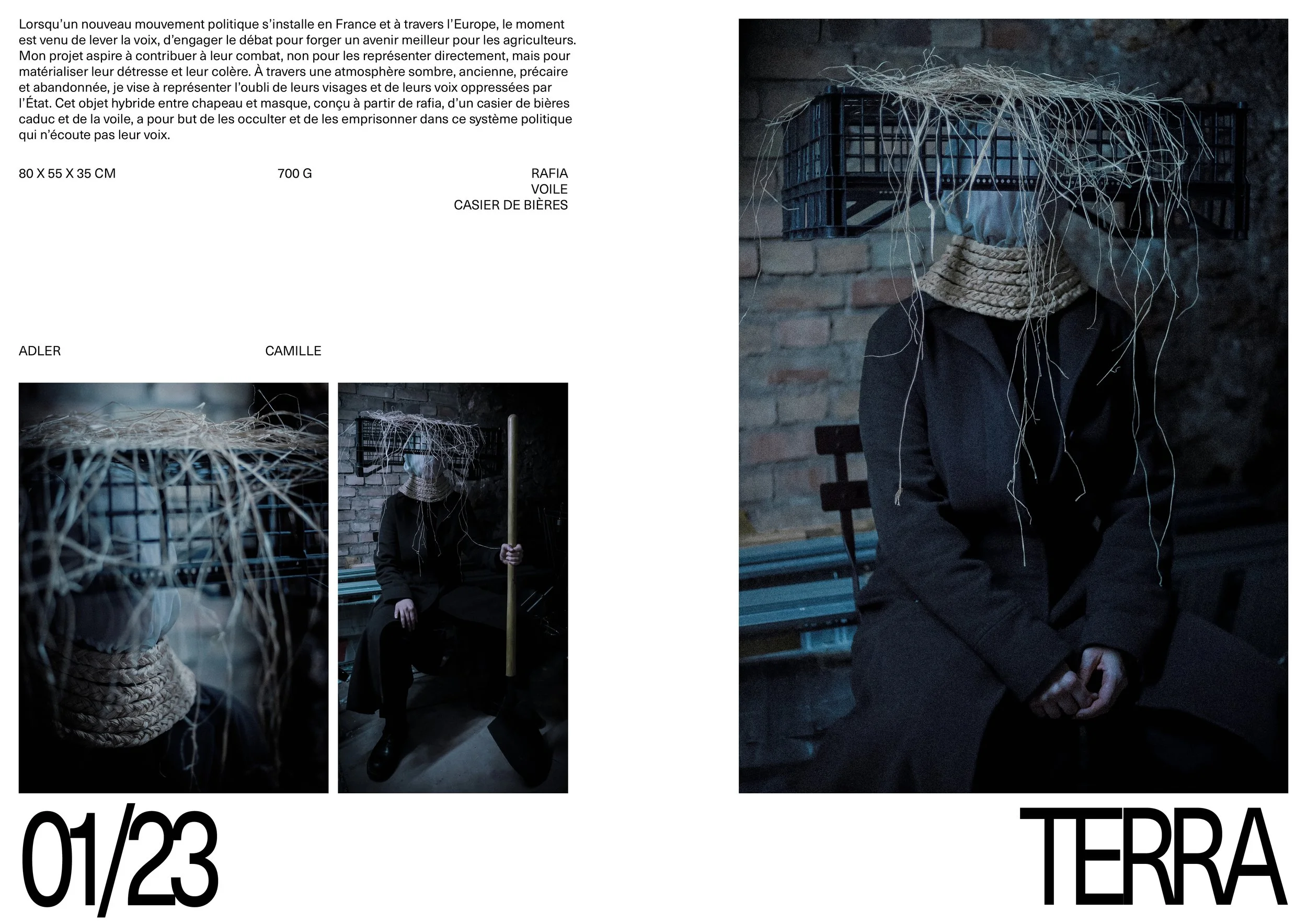 This hybrid object, a cross between a hat and a mask, crafted from raffia, a decrepit beer crate, and fabric, is designed to obscure them—to trap them within a political system that refuses to hear their voices. The title translates from French as ❝ Who sows misery reaps anger❞ , a famous quote from the strikers.